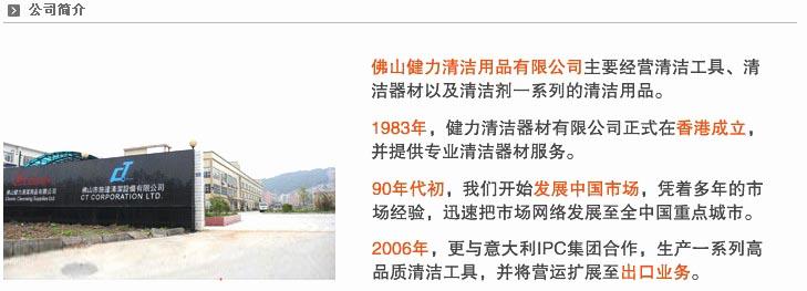 佛山健力清潔用品有限公司公司于1983在香港成立,初時主要業務是提供清潔機械之維修保養及清潔技術顧問,并兼營機械銷售,后憑著多年累積之市場及維修保養經驗,直接引進歐美各地之專業產品及技術,而配套成為深受用戶們信賴之健力清潔用品系列。 健力用品供應有限公司于1991年展開在中國國內之業務,總部設于廣東佛山市,而分銷網絡已遍及各省主要城市。佛山總部除陳列室外,并設有倉庫及維修中心,以支持各地分銷業務需要,務求能提供高質之服務予使用客戶。